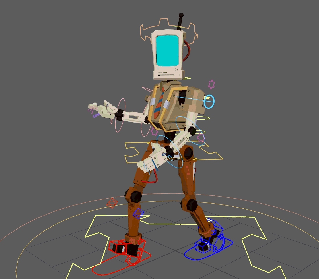 "Eric" is an enemy robot from our game "Rage Quit". On the outside, this is a simple rig, but under the hood it has some interesting work. The entire rig was created using matrix math in Maya, meaning that NO constraints were used in the making of this rig. Learning matrix math opened my eyes to the underlying reasons why rigs work the way they do. The relationship between 3D space, the objects within it, and optimization was something that fascinated me and was a joy to learn more about.