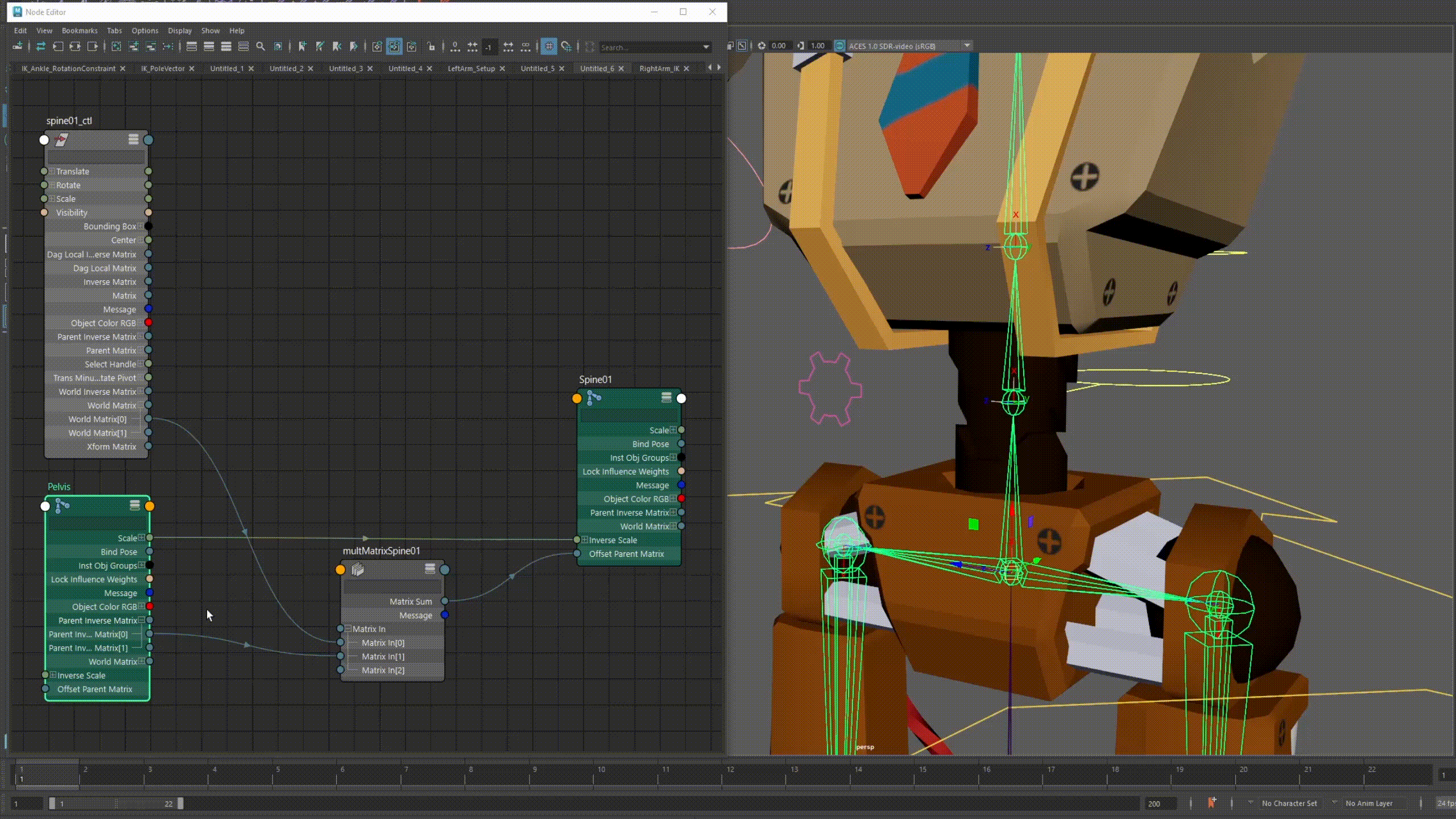 The spine is where I have my first use of matrix math to connect controllers to joints. I want the joints to follow the controllers in world space. To do this, I connected the world matrix of the controller and multiply it by the parent inverse matrix of the parent joint, the pelvis. Let's take a look at the 3 numbers we're working with for this problem.